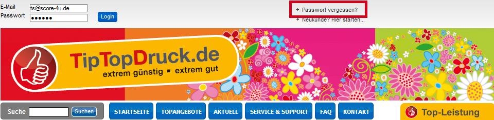 Sie haben Ihr Passwort vergessen? Im Bereich der Kopfzeile des Online-Shops mit Klick auf „Passwort vergessen?" können Sie Ihre Zugangsdaten erneut anfordern. Ihre Zugangsdaten werden Ihnen dann per E-Mail zugesendet.